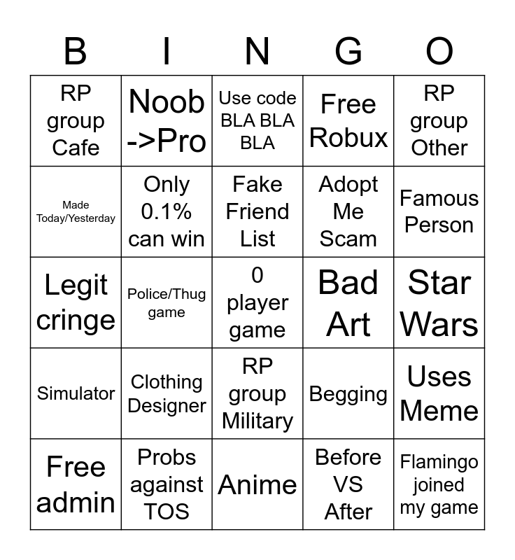 This bingo card has 25 words: Clothing Designer, Anime, Fake Friend List, Free admin, RP group Other, RP group Cafe, Made Today/Yesterday, Noob ->Pro, Bad Art, RP group Military, Adopt Me Scam, Legit cringe, Begging, Uses Meme, Only 0.1% can win, Flamingo joined my game, Star Wars, Use code BLA BLA BLA, Famous Person, Police/Thug game, 0 player game, Probs against TOS, Simulator, Free Robux and Before VS After.