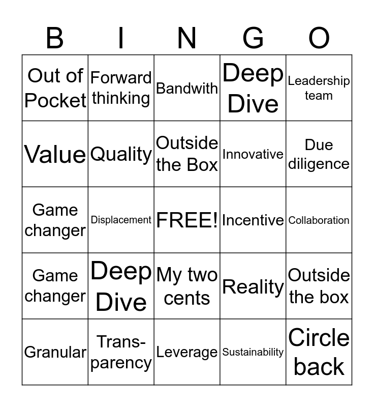 This bingo card has a free space and 24 words: Deep Dive, Trans-parency, Outside the Box, Granular, Leadership team, Out of Pocket, Value, Forward thinking, Incentive, My two cents, Innovative, Game changer, Reality, Outside the box, Quality, Sustainability, Collaboration, Bandwith, Due diligence, Displacement, Circle back, Game changer, Deep Dive and Leverage.