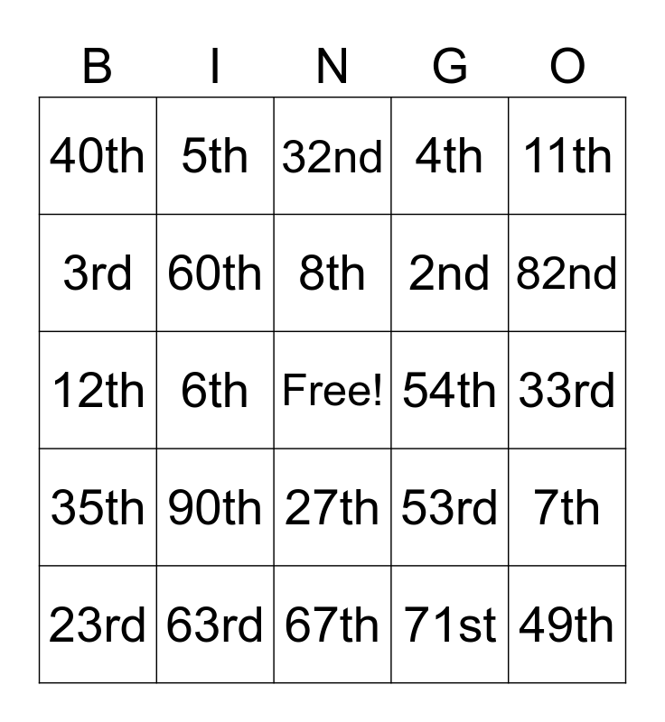 This bingo card has a free space and 29 words: 23rd, 21st, 6th, 30th, 40th, 32nd, 60th, 90th, 54th, 63rd, 33rd, 49th, 67th, 71st, 82nd, 93rd, 27th, 35th, 11th, 12th, 53rd, 1st, 2nd, 3rd, 4th, 5th, 7th, 8th and 9th.