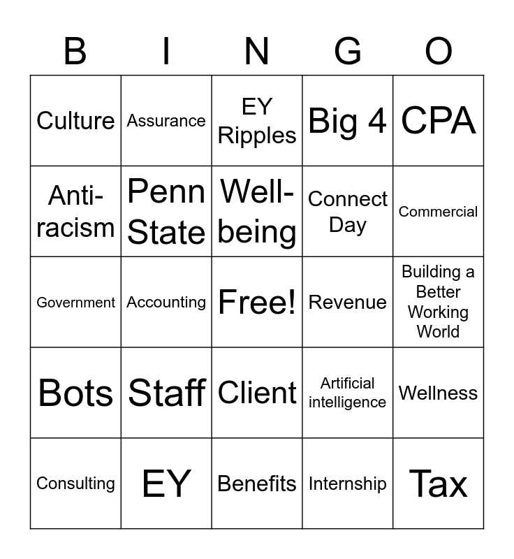 This bingo card has a free space and 43 words: Audit, Tax, Enterprise Risk, Consulting, Futures, Internship, EY Ripples, Excel, CPA, EY, Big 4, Revenue, Client, Staff, Experience EY, Benefits, Industry, Government, Financial Services, Commercial, Assurance, Global Mindset, Badges, Culture, People, Building a Better Working World, Tech MBA, Blockchain, Artificial intelligence, Bots, Leadership, Wellness, Penn State, Accounting, IPOs, Entrepreneurs, Mental health, Well-being, Anti-racism, Connect Day, Students, Penn State and Integrated MAcc.