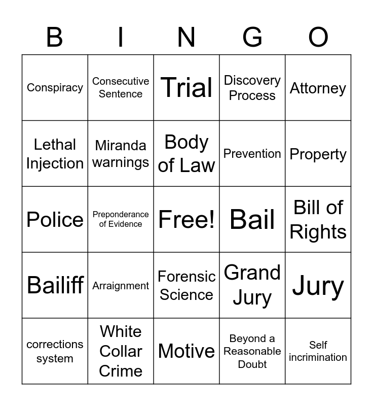 This bingo card has a free space and 39 words: accused, arson, felony, Miranda warnings, corrections system, Forensic Science, Body of Law, Prosecutor, Attorney, Bailiff, Preponderance of Evidence, Discovery Process, Self incrimination, Bill of Rights, Bail, Arraignment, Capital Punishment, Conspiracy, Parole, Grand Jury, Lethal Injection, Motive, Prevention, Property, Plea Bargain, Probation, Misdemeanor, Felony, Justification, Consecutive Sentence, Attorney General, Judge, Trial, White Collar Crime, Beyond a Reasonable Doubt, Witness, Jury, Police and Defense Attorney.