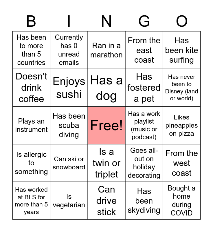 This bingo card has a free space and 49 words: Bought a car during COVID, Bought a home during COVID, Can bake a cake from scratch, Can drive stick, Can ski or snowboard, Collects something, Currently has 0 unread emails, Cuts their own hair, Doesn't drink coffee, Drinks 2+ cups of coffee a day, Enjoys sushi, From the east coast, From the west coast, Goes all-out on holiday decorating, Has a birthday on a holiday, Has a cat, Has a dog, Has a work playlist (music or podcast), Has been a spelling bee champ, Has been kite surfing, Has been scuba diving, Has been skydiving, Has been to more than 5 countries, Has fostered a pet, Has more than three pets, Has never been to Disney (land or world), Has worked at BLS for more than 5 years, Has/maintains a home garden, Is a twin or triplet, Is allergic to something, Is an only child, Is part of a book club, Is the oldest sibling, Is the youngest sibling, Is vegetarian, Knows ASL, Knows how to knit, Knows how to surf, Likes pineapples on pizza, Lived in another country, Met a celebrity, Owns a pet bird, Participates in a sports league, Picked up a new talent during COVID, Plays an instrument, Ran in a marathon, Speaks 3+ languages, Wakes up before 6 AM regularly and Wears contact lenses.