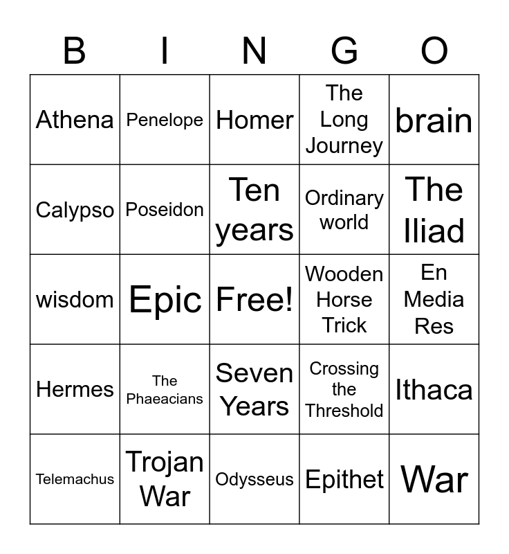 This bingo card has a free space and 24 words: The Phaeacians, Trojan War, Ten years, Telemachus, brain, Athena, Calypso, Penelope, Wooden Horse Trick, Seven Years, Ordinary world, wisdom, Crossing the Threshold, Ithaca, Poseidon, Epithet, En Media Res, Homer, The Iliad, Epic, War, Hermes, The Long Journey and Odysseus.