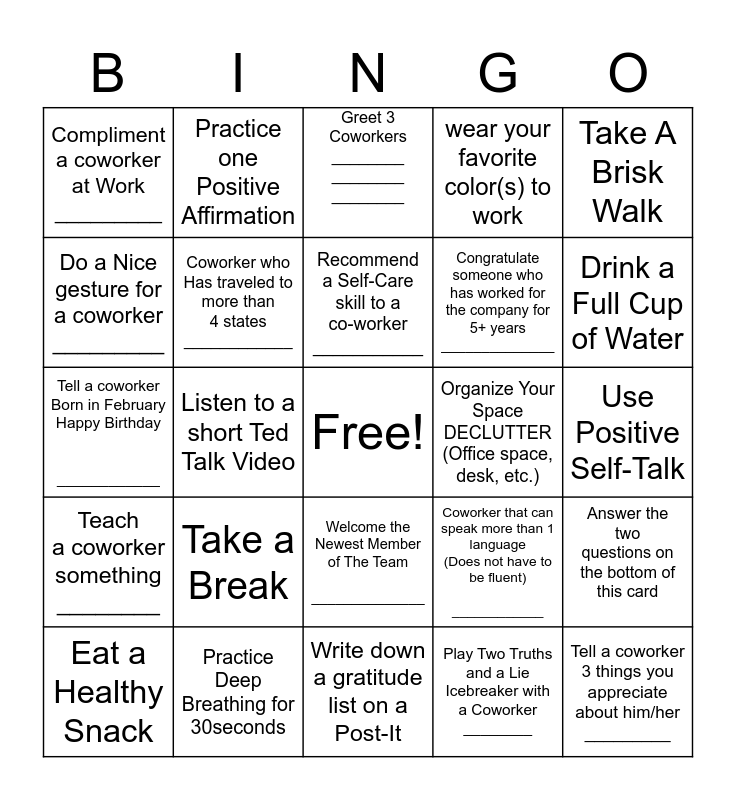 This bingo card has a free space and 24 words: Take a Break, Practice Deep Breathing for 30seconds, Recommend a Self-Care skill to a co-worker ___________, Eat a Healthy Snack, Take A Brisk Walk, Compliment a coworker at Work _________, Do a Nice gesture for a coworker _________, Practice one Positive Affirmation, Organize Your Space DECLUTTER (Office space, desk, etc.), Welcome the Newest Member of The Team ______________, Congratulate someone who has worked for the company for 5+ years ______________, Tell a coworker Born in February Happy Birthday ____________, Coworker that can speak more than 1 language (Does not have to be fluent) ____________, Answer the two questions on the bottom of this card, Coworker who Has traveled to more than 4 states ____________, Play Two Truths and a Lie Icebreaker with a Coworker ________, Use Positive Self-Talk, Greet 3 Coworkers ________ ________ ________, Drink a Full Cup of Water, Listen to a short Ted Talk Video, Tell a coworker 3 things you appreciate about him/her _________, Teach a coworker something ________, wear your favorite color(s) to work and Write down a gratitude list on a Post-It.