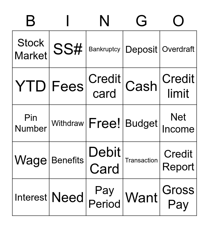 This bingo card has a free space and 39 words: checking account, savings account, ATM, Fees, Interest, Debit Card, Credit card, Online Banking, Overdraft, Wage, Withdraw, Deposit, Gross Pay, Net Income, Budget, Benefits, Income tax, Stock Market, Dependant, Transaction, YTD, Pay Period, Cash, Credit limit, Crypto currency, Debt, Goal, Occupation, Raise, SS#, Consumer, Credit Score, Bankruptcy, Need, Want, Minimum Payment, Credit Report, Pin Number and Comparison Shopping.