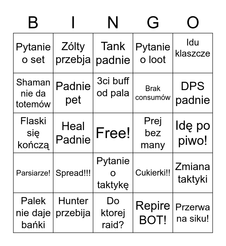 This bingo card has a free space and 24 words: Spread!!!, Hunter przebija, 3ci buff od pala, Palek nie daje bańki, Idu klaszcze, Pytanie o set, Shaman nie da totemów, Zólty przebja, Prej bez many, Pytanie o taktykę, Brak consumów, Flaski się kończą, Cukierki!!, Zmiana taktyki, Padnie pet, Repire BOT!, Idę po piwo!, Tank padnie, DPS padnie, Heal Padnie, Przerwa na siku!, Parsiarze!, Pytanie o loot and Do ktorej raid?.