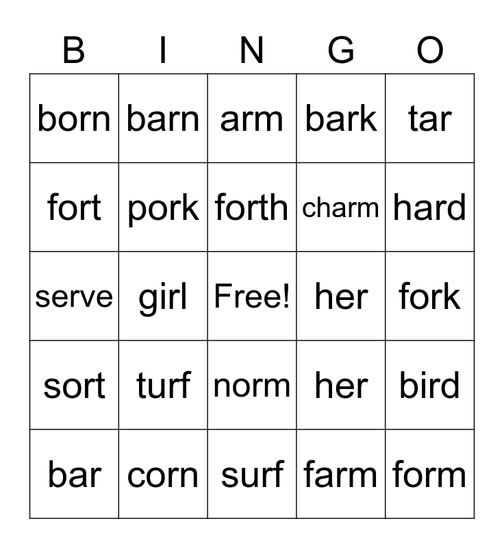 This bingo card has a free space and 29 words: bar, car, girl, for, born, arm, pork, turf, her, corn, fork, form, surf, farm, hard, turn, norm, sort, tar, serve, her, cork, charm, fort, bark, barn, bird, forth and hard.