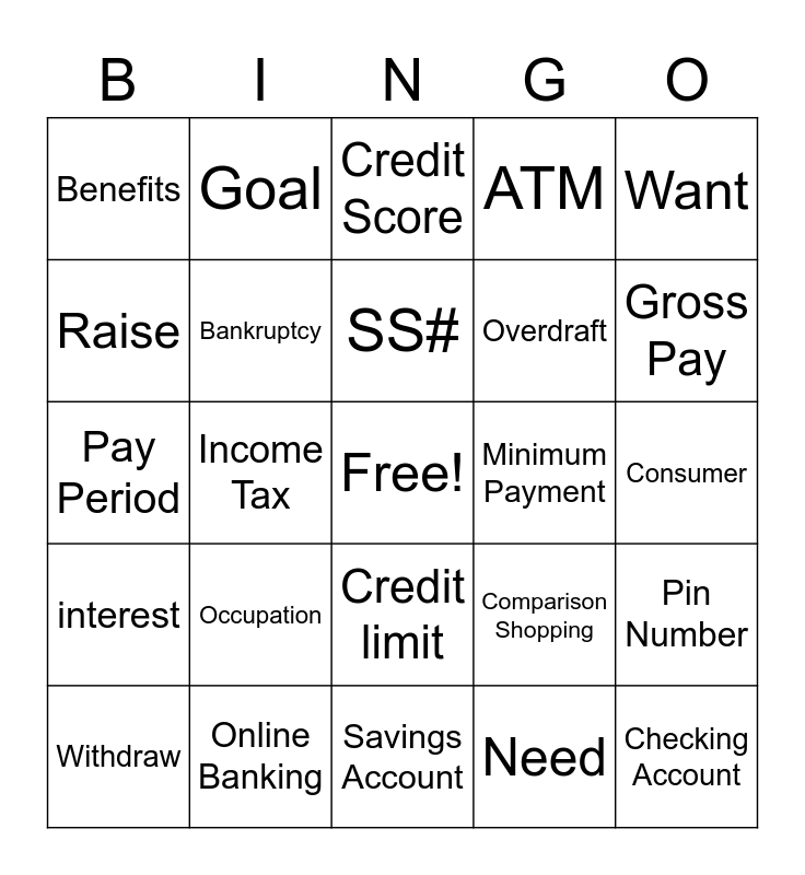 This bingo card has a free space and 39 words: Dependent, Debit Card, Credit Report, Bankruptcy, Withdraw, Credit limit, SS#, Transaction, Want, interest, Income Tax, ATM, Checking Account, Consumer, Minimum Payment, Occupation, Wage, Benefits, Fees, Comparison Shopping, Raise, Savings Account, Overdraft, Gross Pay, cash, YTD, Net Income, Debt, Deposit, Goal, Stock Market, Credit Card, Credit Score, Online Banking, Need, Want, Pin Number, Pay Period and Budget.