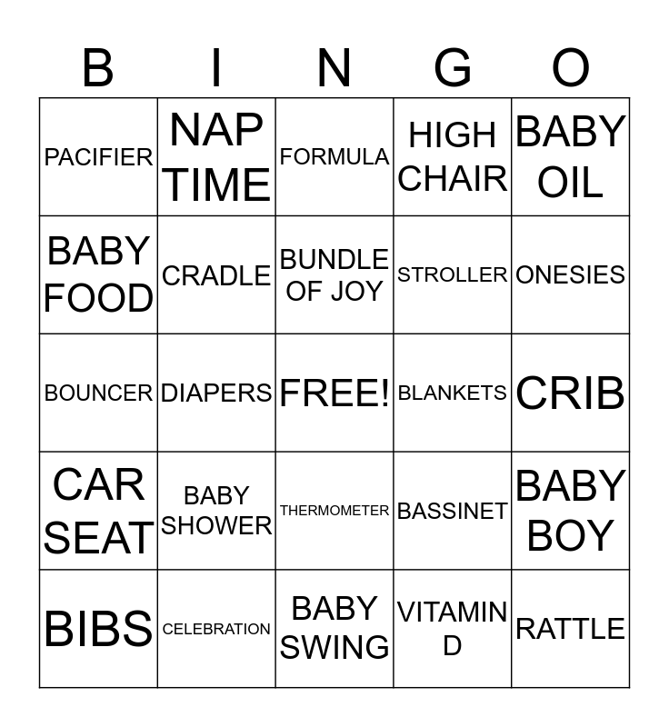 This bingo card has a free space and 24 words: BABY SHOWER, CELEBRATION, BUNDLE OF JOY, BIBS, BABY OIL, PACIFIER, BABY FOOD, NAP TIME, BLANKETS, THERMOMETER, STROLLER, BOUNCER, BASSINET, BABY BOY, CRADLE, VITAMIN D, CRIB, FORMULA, ONESIES, DIAPERS, RATTLE, CAR SEAT, HIGH CHAIR and BABY SWING.