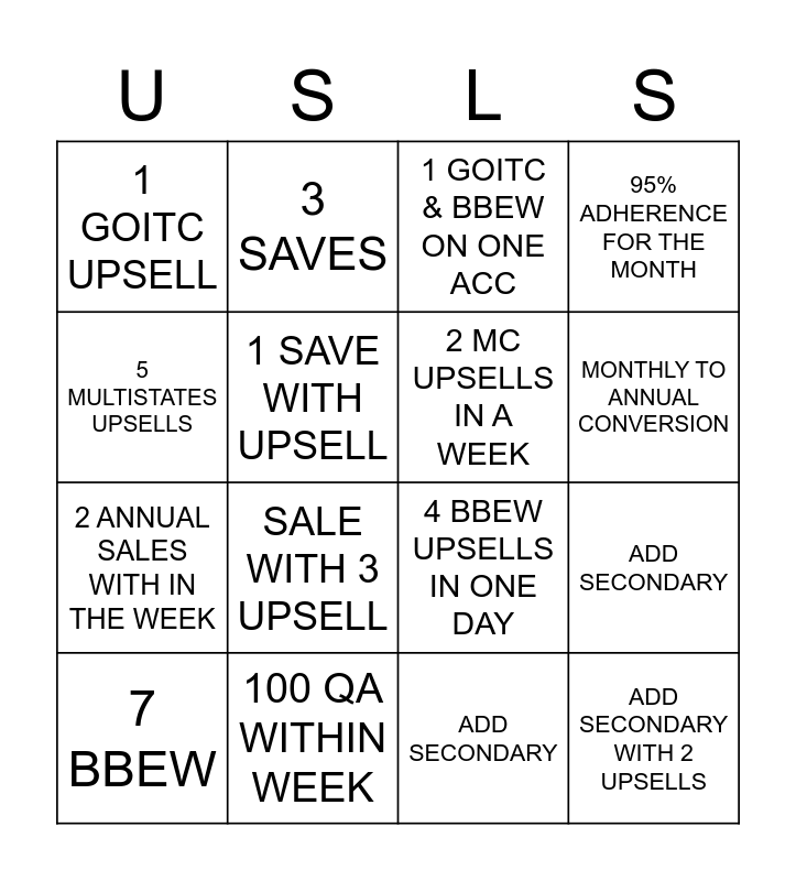 This bingo card has 16 words: 7 BBEW, 100 QA WITHIN WEEK, 1 GOITC & BBEW ON ONE ACC, 95% ADHERENCE FOR THE MONTH, 5 MULTISTATES UPSELLS, 3 SAVES, 4 BBEW UPSELLS IN ONE DAY, ADD SECONDARY, 1 GOITC UPSELL, 1 SAVE WITH UPSELL, ADD SECONDARY, MONTHLY TO ANNUAL CONVERSION, 2 ANNUAL SALES WITH IN THE WEEK, SALE WITH 3 UPSELL, 2 MC UPSELLS IN A WEEK and ADD SECONDARY WITH 2 UPSELLS.