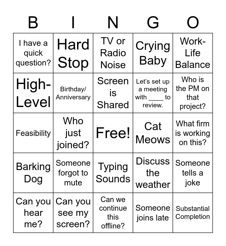 This bingo card has a free space and 42 words: Pandemic, Screen is Shared, Someone drops of early, Someone forgot to mute, Someone joins late, Someone tells a joke, Substantial Completion, This project is in ____ phase., TV or Radio Noise, Typing Sounds, What firm is working on this?, Who is the PM on that project?, Who just joined?, Work-Life Balance, Deep Dive, Discuss the weather, Does this have an approved requisition?, Feasibility, Funny Backdrop on Screen, Hard Stop, High-Level, How was your (vacay, weekend, etc)?, I am having connection issues ., I have a quick question?, Is Ryan Weber/Data Analytics team involved?, Kudos, Let’s set up a meeting with ____ to review., Loud Feedback Noise, Low-hanging Fruit, Manpower, (Overtalk) Sorry you go first.., Barking Dog, Birthday/ Anniversary, Can we continue this offline?, Can you hear me?, Can you hear me?, Can you see my screen?, Cat Meows, Correct me if I'm wrong…, Covid/Coronavirus, Crying Baby and Curse word used.
