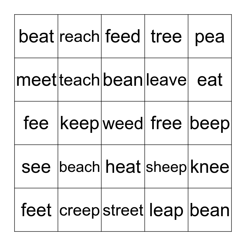 This bingo card has a free space and 24 words: beach, creep, bean, feet, pea, beat, meet, reach, free, heat, leave, fee, sheep, knee, teach, leap, beep, feed, eat, keep, bean, see, tree and street.