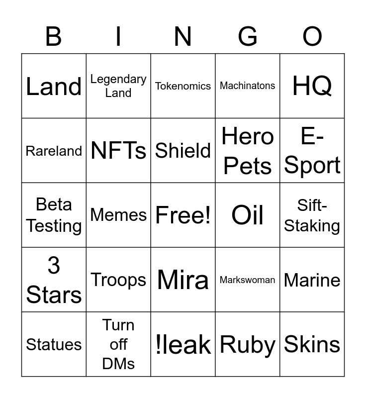 This bingo card has a free space and 24 words: Statues, Troops, Shield, Ruby, HQ, Land, Legendary Land, Tokenomics, Oil, Sift-Staking, Beta Testing, NFTs, Markswoman, Marine, Rareland, Turn off DMs, !leak, Machinatons, E-Sport, 3 Stars, Memes, Mira, Hero Pets and Skins.
