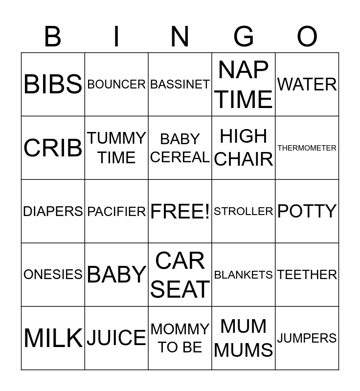 This bingo card has a free space and 24 words: BABY, JUICE, BABY CEREAL, MILK, WATER, BIBS, CRIB, BOUNCER, STROLLER, CAR SEAT, HIGH CHAIR, DIAPERS, BLANKETS, TEETHER, TUMMY TIME, MUM MUMS, POTTY, BASSINET, THERMOMETER, PACIFIER, JUMPERS, ONESIES, NAP TIME and MOMMY TO BE.