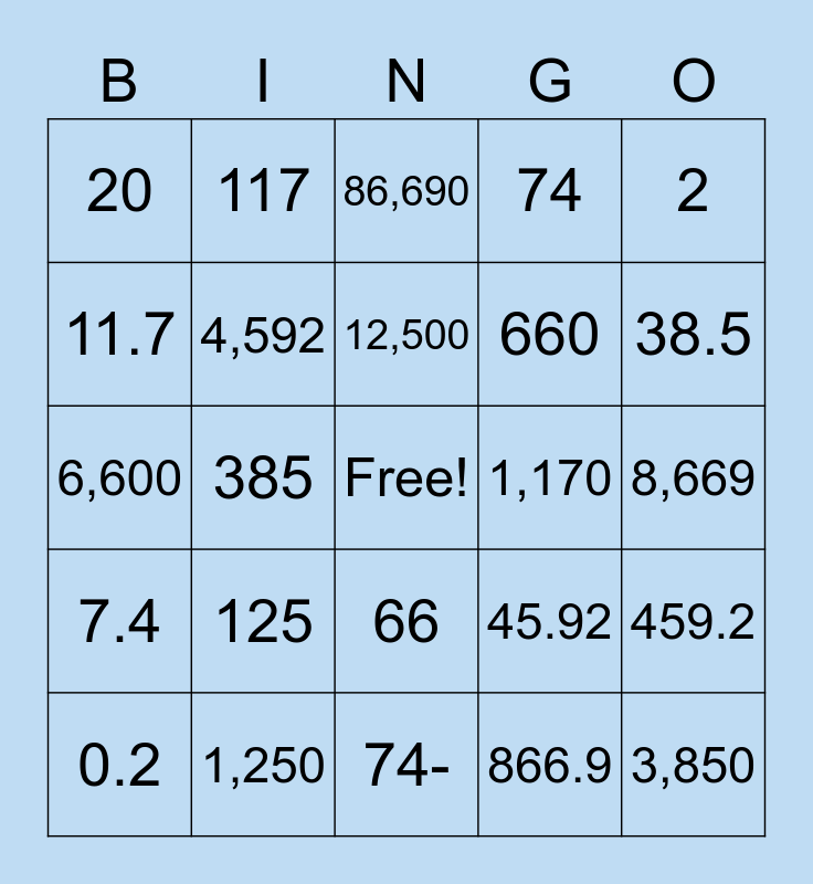 This bingo card has a free space and 24 words: 125, 1,250, 12,500, 0.2, 2, 20, 11.7, 117, 1,170, 66, 660, 6,600, 45.92, 459.2, 4,592, 866.9, 8,669, 86,690, 38.5, 385, 3,850, 7.4, 74 and 74-.