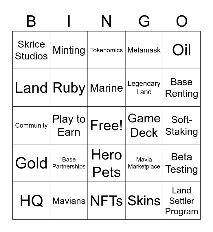 This bingo card has a free space and 24 words: HQ, Base Partnerships, Marine, Skins, Oil, Skrice Studios, Minting, Tokenomics, Game Deck, Soft-Staking, Community, Ruby, Mavia Marketplace, Beta Testing, Land, Mavians, NFTs, Metamask, Base Renting, Gold, Play to Earn, Hero Pets, Legendary Land and Land Settler Program.