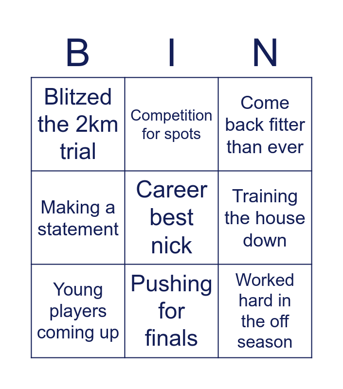 This bingo card has a free space and 8 words: Training the house down, Come back fitter than ever, Competition for spots, Young players coming up, Blitzed the 2km trial, Worked hard in the off season, Making a statement and Pushing for finals.