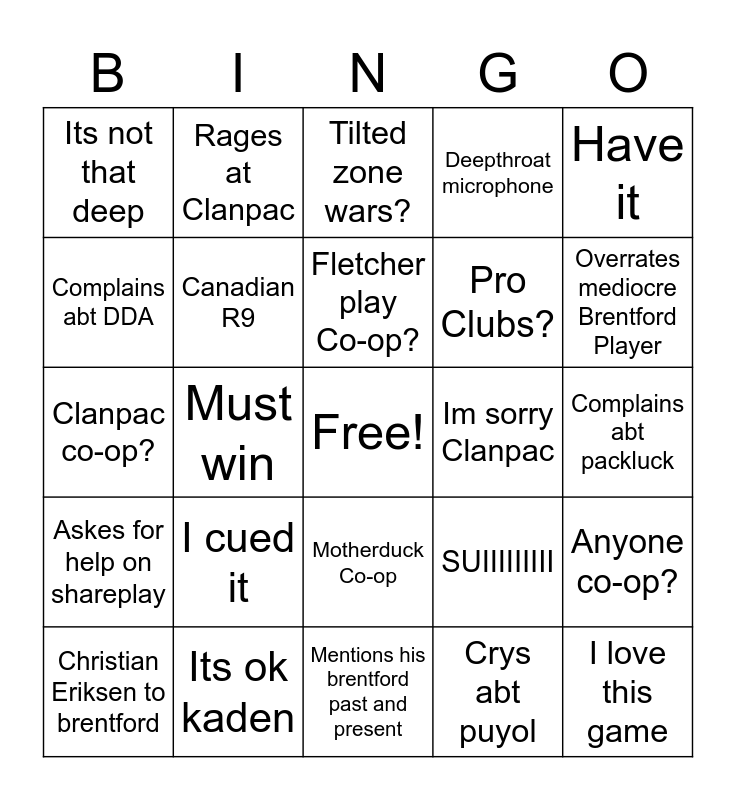 This bingo card has a free space and 24 words: Christian Eriksen to brentford, I cued it, Fletcher play Co-op?, Crys abt puyol, Have it, Its not that deep, Rages at Clanpac, Tilted zone wars?, Im sorry Clanpac, Complains abt packluck, Clanpac co-op?, Canadian R9, SUIIIIIIIII, Anyone co-op?, Complains abt DDA, Its ok kaden, Mentions his brentford past and present, Deepthroat microphone, Overrates mediocre Brentford Player, Askes for help on shareplay, Must win, Motherduck Co-op, Pro Clubs? and I love this game.