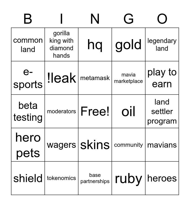 This bingo card has a free space and 44 words: statues, heroes, troops, shield, arbitrum, ruby, hq, land, legendary land, tokenomics, gold, oil, skins, wagers, base renting, base partnerships, soft-staking, beta testing, NFTs, play to earn, gorilla king with diamond hands, markswoman, marine, common land, rare land, land settler program, big hammer king, mira, community, hero pets, memes, mavians, amas, game night, moderators, 3 stars, minting, game deck, metamask, e-sports, mavia marketplace, machinations, !leak and turn of dms.