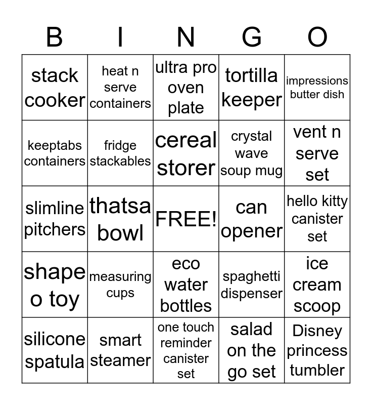 This bingo card has a free space and 24 words: measuring cups, smart steamer, cereal storer, silicone spatula, impressions butter dish, stack cooker, keeptabs containers, heat n serve containers, can opener, eco water bottles, crystal wave soup mug, slimline pitchers, spaghetti dispenser, ice cream scoop, fridge stackables, salad on the go set, hello kitty canister set, ultra pro oven plate, vent n serve set, thatsa bowl, Disney princess tumbler, shape o toy, tortilla keeper and one touch reminder canister set.