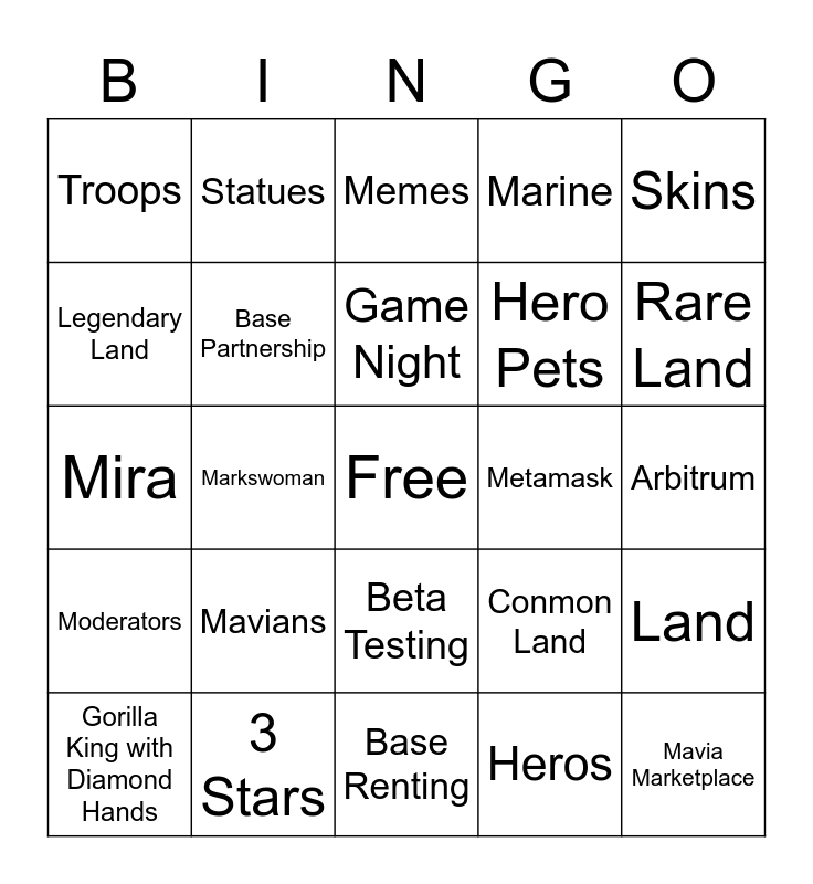 This bingo card has a free space and 24 words: Mavians, 3 Stars, Game Night, Gorilla King with Diamond Hands, Skins, Troops, Legendary Land, Statues, Metamask, Beta Testing, Hero Pets, Mira, Conmon Land, Land, Base Partnership, Heros, Arbitrum, Memes, Rare Land, Markswoman, Mavia Marketplace, Moderators, Marine and Base Renting.