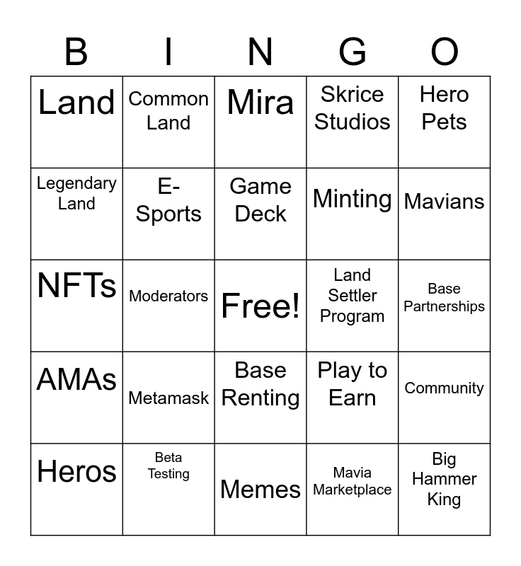 This bingo card has a free space and 24 words: Metamask, Beta Testing, Game Deck, Heros, Hero Pets, Land, Legendary Land, Common Land, Land Settler Program, Base Renting, Minting, NFTs, Play to Earn, Community, E-Sports, Mavia Marketplace, Base Partnerships, Mira, Mavians, Moderators, Big Hammer King, AMAs, Skrice Studios and Memes.