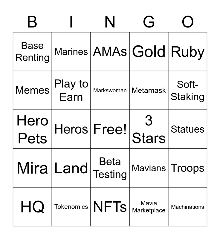 This bingo card has a free space and 24 words: Land, Tokenomics, Markswoman, HQ, Ruby, Base Renting, Memes, Marines, 3 Stars, Beta Testing, Metamask, Hero Pets, Mavians, Troops, Play to Earn, Mavia Marketplace, Statues, AMAs, Soft-Staking, Heros, Machinations, Mira, Gold and NFTs.