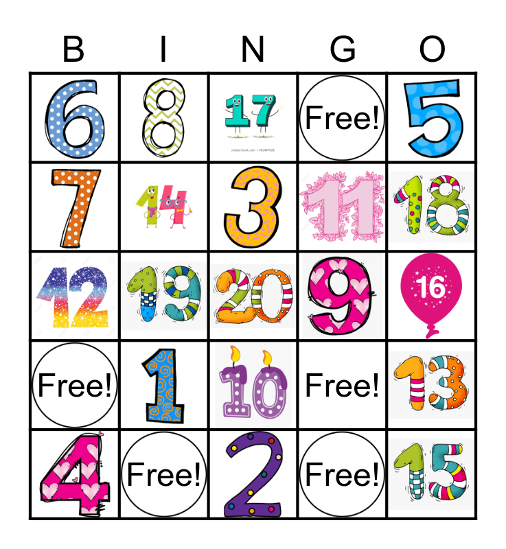 This bingo card has 24 images and 5 words: Free!, Free!, Free!, Free! and Free!.