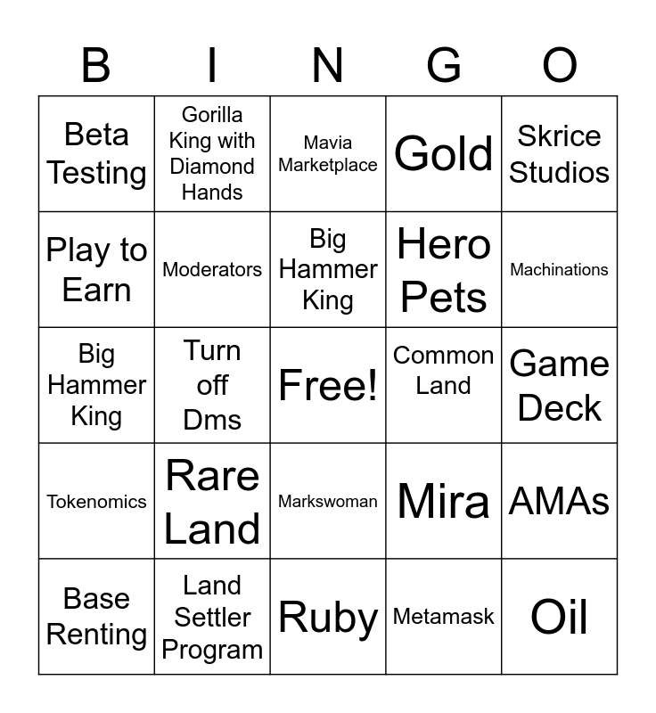 This bingo card has a free space and 24 words: Rare Land, Land Settler Program, Big Hammer King, Base Renting, Skrice Studios, Beta Testing, Play to Earn, Gorilla King with Diamond Hands, Common Land, Markswoman, Hero Pets, Big Hammer King, Mira, AMAs, Moderators, Metamask, Game Deck, Mavia Marketplace, Machinations, Turn off Dms, Oil, Tokenomics, Gold and Ruby.