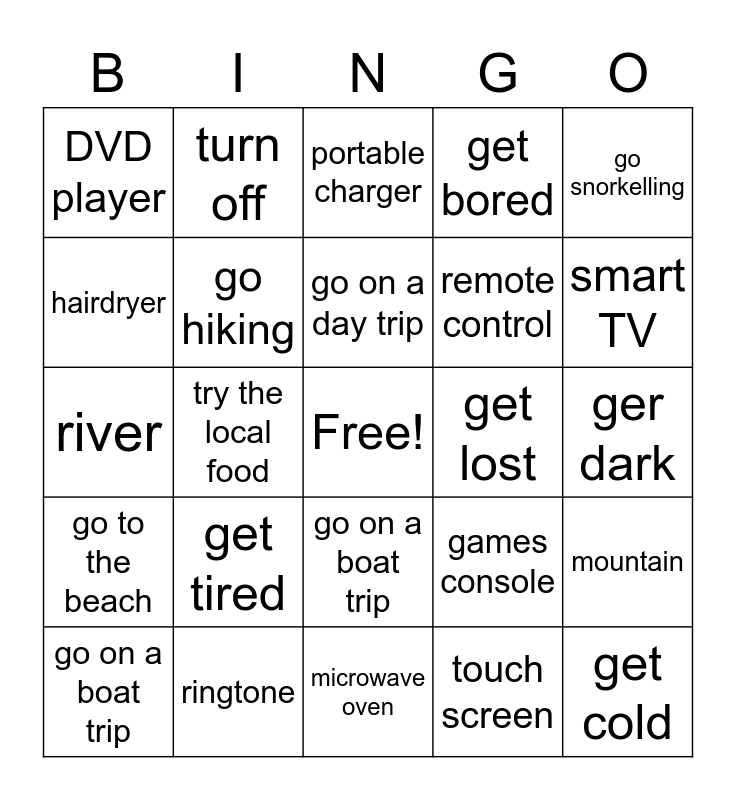 This bingo card has a free space and 39 words: explore an area, go camping, go cycling, go hiking, go on a boat trip, go on a boat trip, go on a day trip, go on a guided tour, go snorkelling, go to the beach, try the local food, get bored, get cold, ger dark, get lost, get tired, blender, DVD player, electric toothbrush, games console, hairdryer, microwave oven, remote control, smart TV, toaster, USB stick, plug in, unplug, turn on, turn off, app, battery, portable charger, ringtone, touch screen, Wi-Fi, mountain, river and garden.