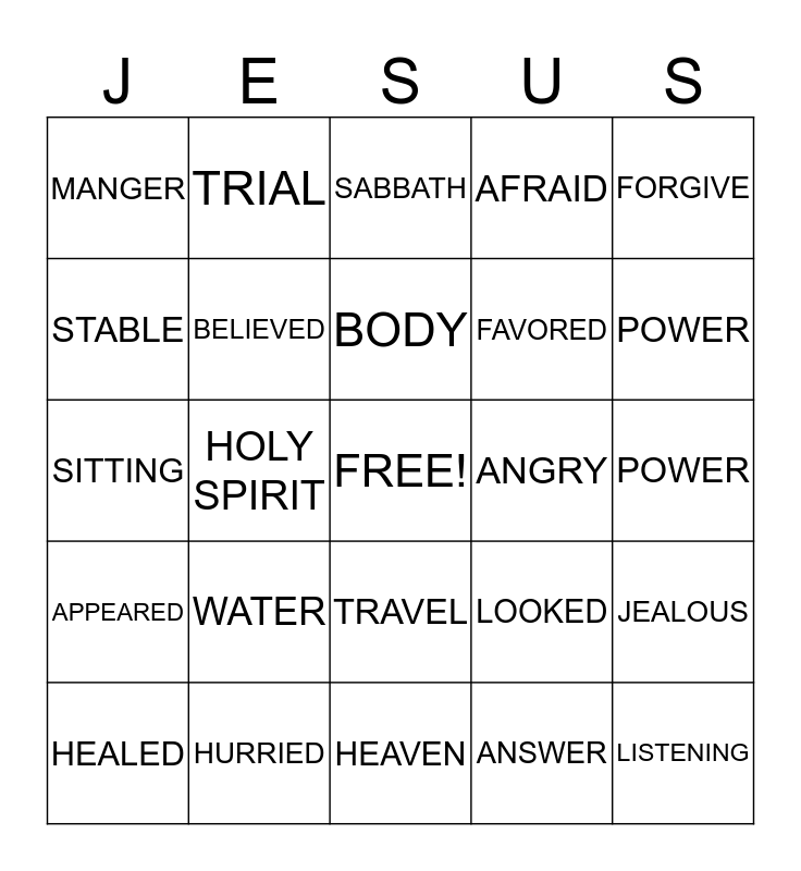 This bingo card has a free space and 32 words: ANSWER, ANSWERED, HOLY SPIRIT, WITNESSES, APPEARED, BELIEVED, FORGIVE, JEALOUS, TRIAL, ALIVE, BODY, SABBATH, WINE, SEARCH, ANGRY, OFFICIALS, HEALED, SITTING, TRAVEL, WATER, LOOKED, SEARCHED, POWER, HURRIED, LISTENING, AFRAID, FAVORED, STABLE, MANGER, HEAVEN, FORGIVE and POWER.