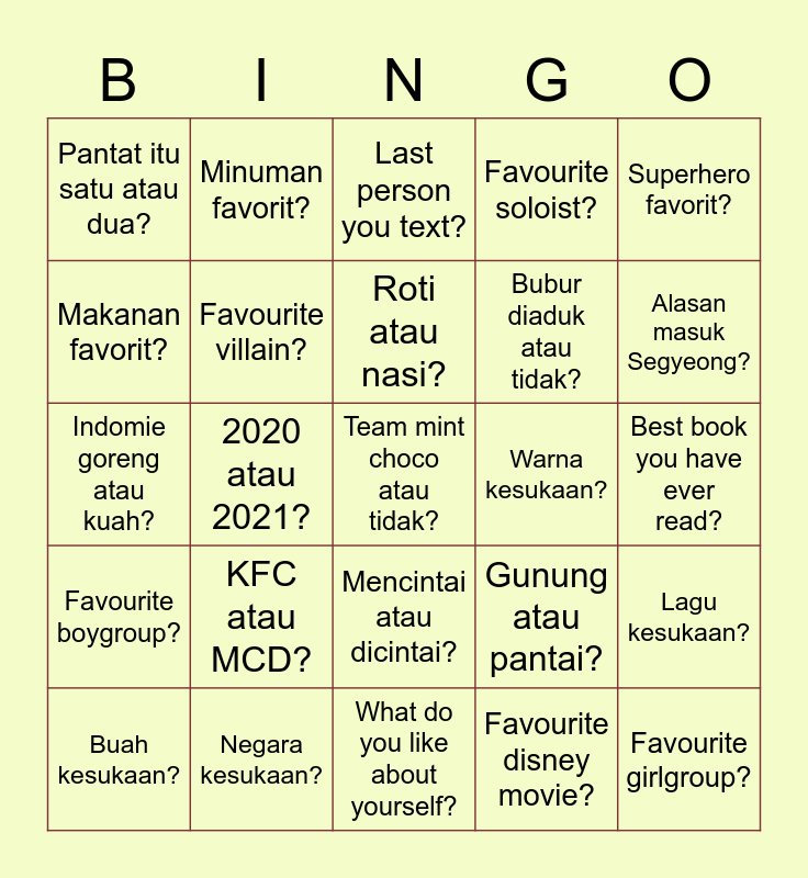 This bingo card has a free space and 24 words: KFC atau MCD?, Negara kesukaan?, Roti atau nasi?, Buah kesukaan?, Superhero favorit?, Pantat itu satu atau dua?, Makanan favorit?, Minuman favorit?, Warna kesukaan?, Mencintai atau dicintai?, Bubur diaduk atau tidak?, Indomie goreng atau kuah?, Gunung atau pantai?, Lagu kesukaan?, Favourite villain?, Favourite disney movie?, Best book you have ever read?, Last person you text?, Alasan masuk Segyeong?, 2020 atau 2021?, Favourite girlgroup?, Favourite boygroup?, Favourite soloist? and What do you like about yourself?.