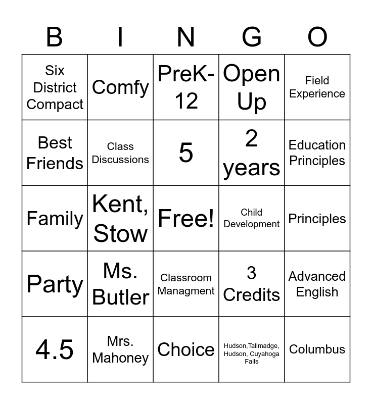 This bingo card has a free space and 24 words: Ms. Butler, Mrs. Mahoney, 5, 4.5, Field Experience, Six District Compact, Best Friends, Comfy, Child Development, Classroom Managment, 2 years, Family, 3 Credits, Advanced English, Class Discussions, Hudson,Tallmadge, Hudson, Cuyahoga Falls, Principles, PreK-12, Education Principles, Kent, Stow, Columbus, Party, Open Up and Choice.