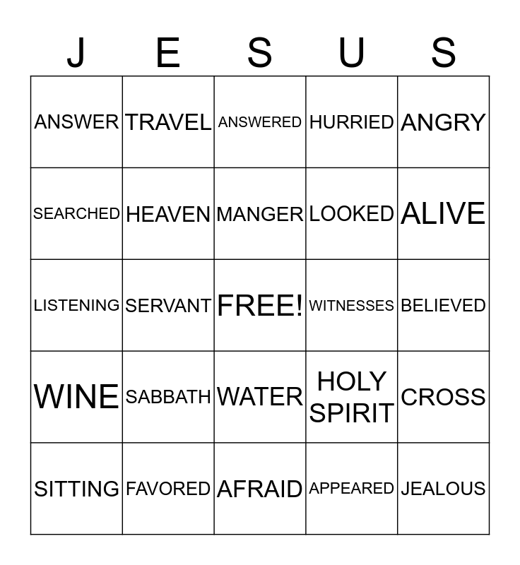 This bingo card has a free space and 31 words: AFRAID, BABY, SERVANT, TEMPLE, ANSWER, ANSWERED, HEAVEN, HOLY SPIRIT, WITNESSES, APPEARED, BELIEVED, JEALOUS, POWER, TRIAL, ALIVE, BODY, CROSS, SABBATH, WINE, WATER, ANGRY, OFFICIALS, SITTING, TRAVEL, LOOKED, SEARCHED, HURRIED, LISTENING, FAVORED, MANGER and FORGIVE.
