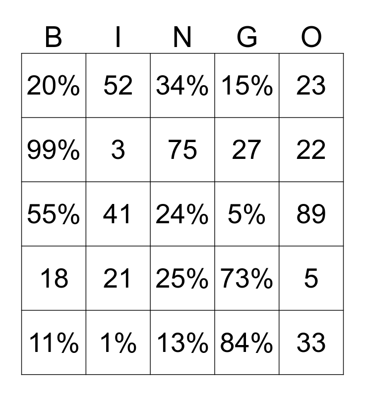This bingo card has 25 words: 21, 13%, 75, 11%, 23, 20%, 99%, 52, 5%, 25%, 27, 55%, 73%, 5, 3, 33, 89, 34%, 22, 41, 24%, 1%, 18, 15% and 84%.