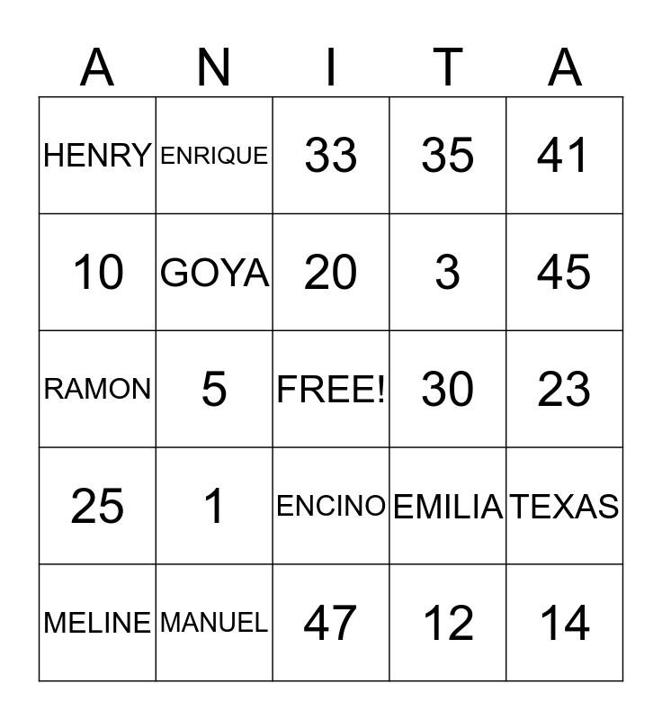 This bingo card has a free space and 24 words: 1, MANUEL, 20, MELINE, 41, HENRY, 10, ENRIQUE, 30, ENCINO, 3, RAMON, EMILIA, TEXAS, GOYA, 12, 23, 33, 45, 5, 14, 25, 35 and 47.