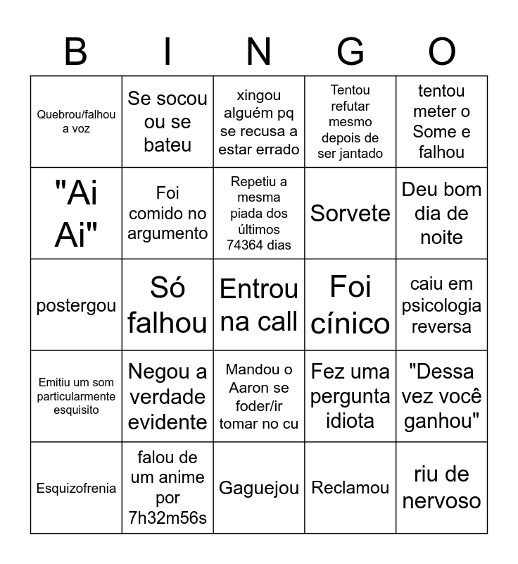 This bingo card has 48 words: falou por 3h27min sobre um jogo que ninguem se importa, Entrou na call, Foi censurado, Gaguejou, Negou a verdade evidente, Tentou parar o tempo, Se socou ou se bateu, Comeu pimenta pq sim, "Ai Ai", "É como já dizia meu pai", Foi comido no argumento, Tentou refutar mesmo depois de ser jantado, "Dessa vez você ganhou", Fez uma pergunta idiota, Cesara a gosto, Enfio o microfone no cu, Repetiu a mesma piada dos últimos 74364 dias, Foi cínico, Foi burro, tentou meter o Some e falhou, Só falhou, Reclamou, Quebrou/falhou a voz, Sorvete, Calou a boca e aceitou, Deu bom dia de noite, Esquizofrenia, Puxou o saco de alguém, Mandou o Aaron se foder/ir tomar no cu, Emitiu um som particularmente esquisito, Concordou que é um merda e que ser um merda é culpa dele, Caiu da call, "Muito previsível", bom dia de noite, falou de um anime por 7h32m56s, falou aleatoriamente algo em 'japonês', falou de faca/katana, caiu em psicologia reversa, reclamou 2, tentou fugir através de 'piadas', passou pano pra si mesmo por ser um bosta, riu de nervoso, xingou alguém pq se recusa a estar errado, foi paranóico, postergou, comportamento masoquista, falou de genshin and riu que nem esquizofrenico.