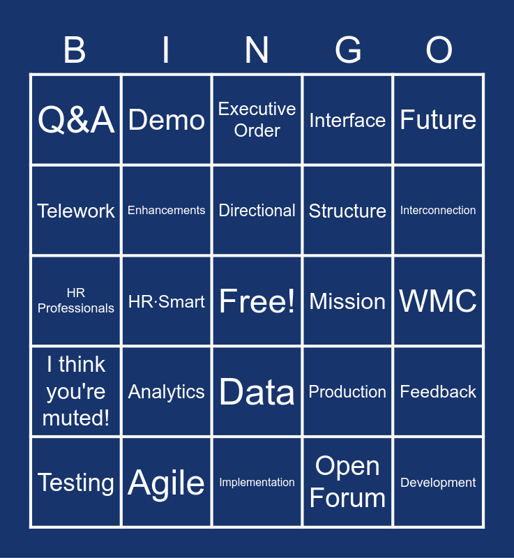 This bingo card has a free space and 49 words: Strategic, Development, Configuration, Implementation, Analytics, Sprint, Demo, Accomplishments, Telework, Roadmap, Enhancements, Interface, Feedback, Production, Releases, Disability, Directional, Mission, Capabilities, Future, HR·Smart, Open Forum, Q&A, Structure, Timeline, Interconnection, Testing, Veterans, Data, I think you're muted!, Change Management, Onboarding, Compensation, Training, Agile, Benefits, Recruitment, Lifecycle, WMC, Classification, Solution, OPM, New Hires, Employees, HR Professionals, Executive Order, PII, Pilot and Title 38.