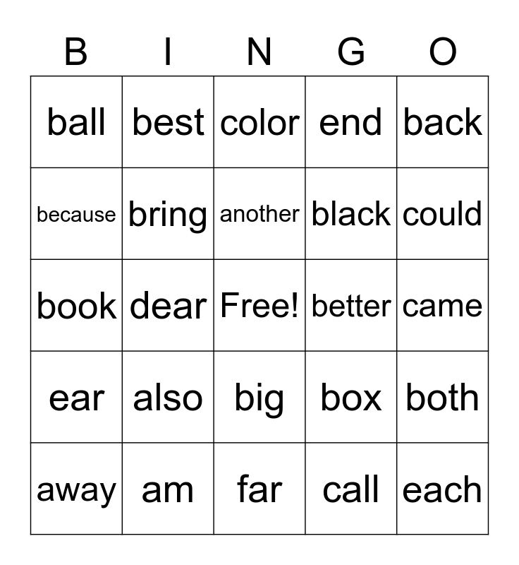 This bingo card has a free space and 24 words: also, am, another, away, back, ball, because, best, better, big, black, book, box, both, bring, call, came, color, could, dear, each, ear, end and far.