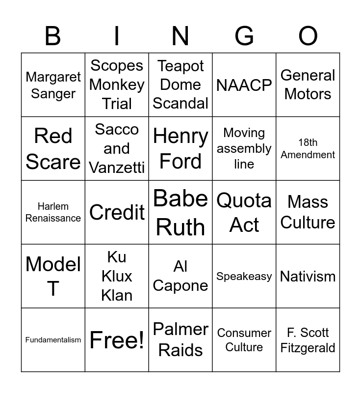 This bingo card has 28 words: Nativism, Flappers, Moving assembly line, Consumer Culture, Red Scare, Teapot Dome Scandal, Scopes Monkey Trial, Model T, Quota Act, Fundamentalism, Harlem Renaissance, NAACP, Free!, Palmer Raids, 18th Amendment, 19th Amendment, Ku Klux Klan, Sacco and Vanzetti, Henry Ford, Al Capone, Margaret Sanger, F. Scott Fitzgerald, Babe Ruth, Credit, Mass Culture, Speakeasy, General Motors and Charles Lindbergh.