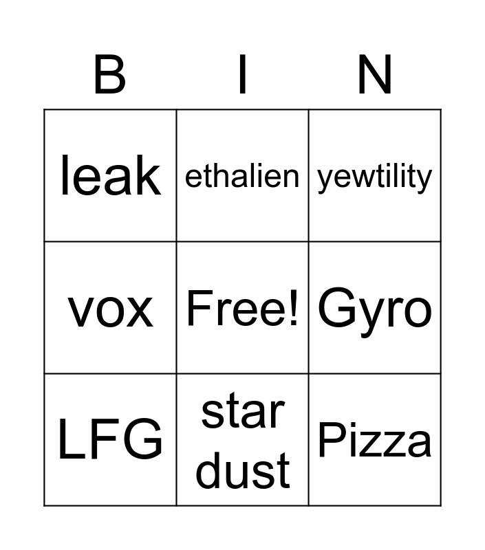 This bingo card has a free space and 18 words: prough ject, pro duck, yewtility, leak, Alpha, vox, star, ethalien, star dust, starcade, Merkish, Pizza, Pass tah, Gyro, LFG, Excited, Website and Play to ear.