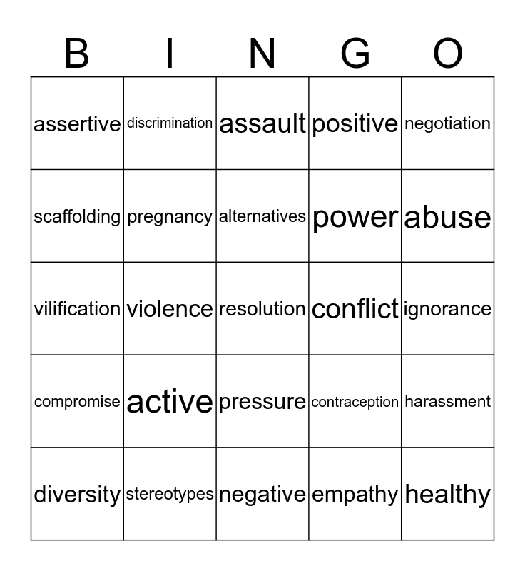 This bingo card has a free space and 24 words: active, stereotypes, alternatives, diversity, negotiation, assertive, scaffolding, discrimination, conflict, pressure, power, vilification, contraception, harassment, pregnancy, empathy, ignorance, assault, abuse, violence, healthy, compromise, positive and negative.