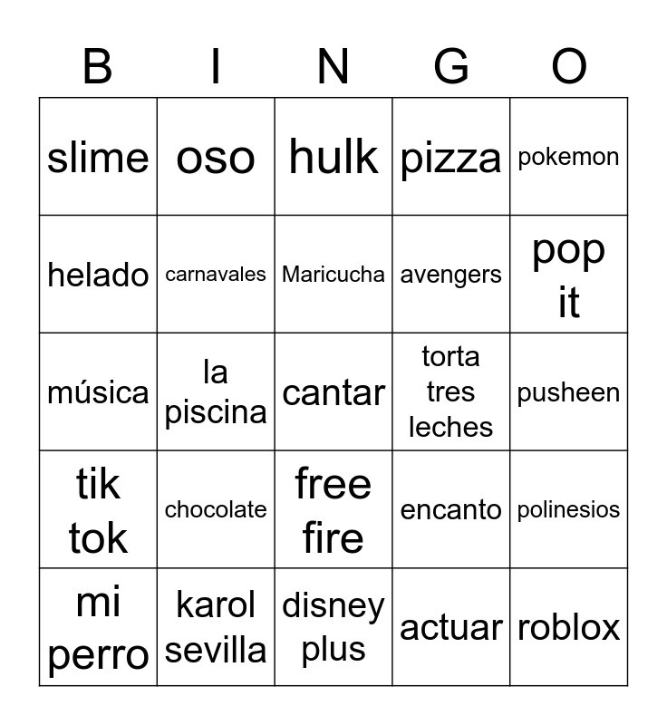 This bingo card has a free space and 24 words: chocolate, karol sevilla, Maricucha, mi perro, pokemon, slime, helado, oso, torta tres leches, free fire, avengers, música, encanto, polinesios, carnavales, actuar, pusheen, hulk, pop it, la piscina, roblox, tik tok, pizza and disney plus.