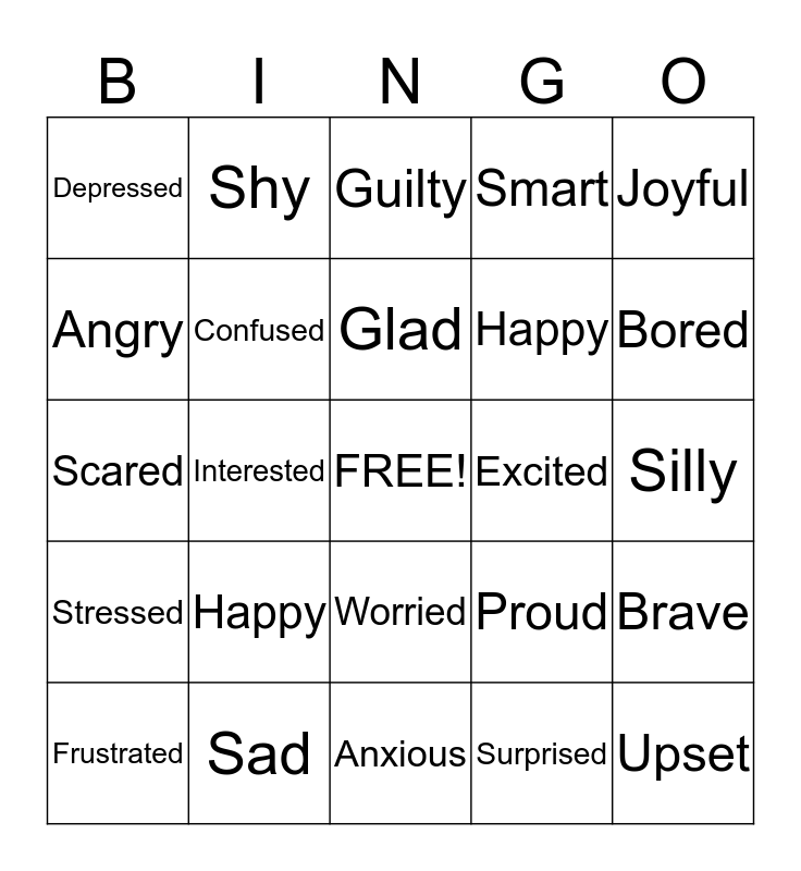This bingo card has a free space and 24 words: Happy, Sad, Glad, Frustrated, Joyful, Depressed, Angry, Shy, Excited, Worried, Happy, Scared, Proud, Brave, Confused, Surprised, Silly, Guilty, Bored, Interested, Upset, Stressed, Smart and Anxious.
