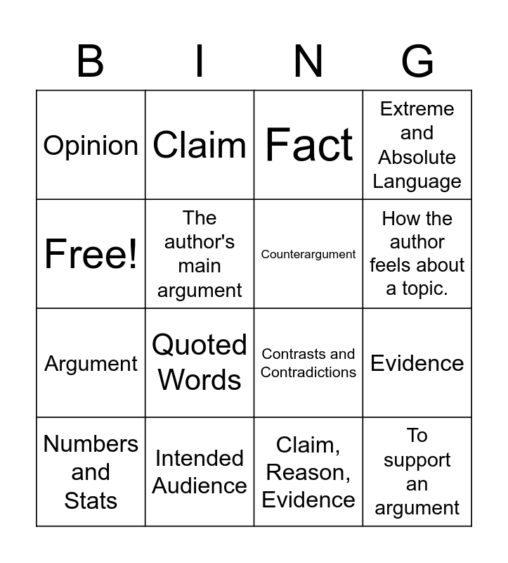 This bingo card has 16 words: Intended Audience, Evidence, Fact, Opinion, Argument, Claim, Contrasts and Contradictions, Claim, Reason, Evidence, Free!, The author's main argument, Numbers and Stats, Extreme and Absolute Language, Quoted Words, How the author feels about a topic., Counterargument and To support an argument.