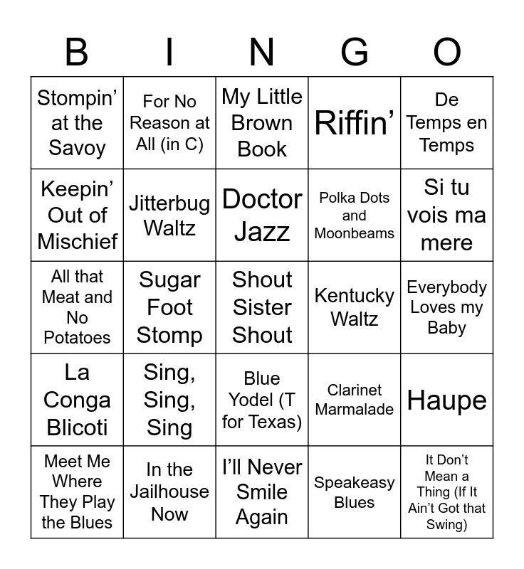 This bingo card has 41 words: Ol’ Man River, All that Meat and No Potatoes, Until the Real Thing Comes Along, Jitterbug Waltz, In the Jailhouse Now, Blue Yodel (T for Texas), Doctor Jazz, Black Bottom Stomp, De Temps en Temps, La Conga Blicoti, Sugar Foot Stomp, Riffin’, Shout Sister Shout, Everybody Loves my Baby, Kentucky Waltz, Sing, Sing, Sing, Chicago, Stompin’ at the Savoy, In a Sentimental Mood, My Little Brown Book, Haupe, It Don’t Mean a Thing (If It Ain’t Got that Swing), I’ll Never Smile Again, Polka Dots and Moonbeams, Alexander’s Ragtime Band, Am I Blue, Speakeasy Blues, Out of Nowhere, Si tu vois ma mere, Summertime, Goin’ Places, For No Reason at All (in C), Meet Me Where They Play the Blues, Singin’ the Blues, Clarinet Marmalade, Keepin’ Out of Mischief, Charleston Crazy, He’s in the Jailhouse Now, Heebie Jeebies, Muskrat Ramble and Ain’t Misbehavin’.