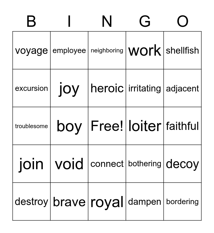 This bingo card has a free space and 26 words: connect, dampen, heroic, brave, shellfish, voyage, excursion, employee, faithful, bothering, irritating, troublesome, decoy, destroy, boy, labor, work, join, neighboring, bordering, adjacent, royal, loiter, void, joy and pleasure.