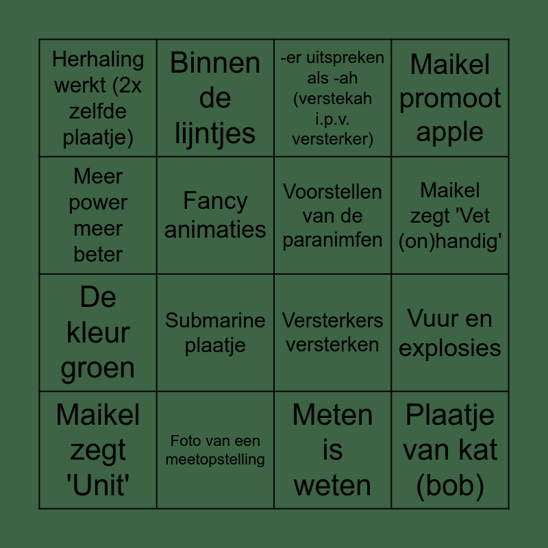 This bingo card has 19 words: Versterkers versterken, Paul Elstak, -er uitspreken als -ah (verstekah i.p.v. versterker), Plaatje van kat (bob), Vuur en explosies, Meer power meer beter, Meten is weten, Herhaling werkt (2x zelfde plaatje), Binnen de lijntjes, De kleur groen, Submarine plaatje, Fancy animaties, Voorstellen van de paranimfen, Foto van een meetopstelling, Maikel zegt 'Unit', Grote getallen, Maikel promoot apple, Maikel zegt 'Vet (on)handig' and Maikel legt uit over golven.
