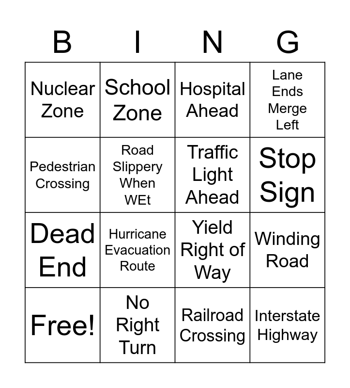 This bingo card has 23 words: Interstate Highway, Red Light Camera, Stop Sign, Workers Ahead, Pedestrian Crossing, Nuclear Zone, Road Slippery When WEt, School Zone, Free!, No U Turn, Hurricane Evacuation Route, Dead End, Deer Crossing, Flagger Ahead, No Right Turn, One Way Traffic, Hospital Ahead, Yield Right of Way, Traffic Light Ahead, Winding Road, Lane Ends Merge Left, Railroad Crossing and No Left Turn.