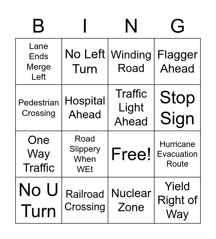 This bingo card has 22 words: Railroad Crossing, Dead End, No Left Turn, No Right Turn, Hospital Ahead, Traffic Light Ahead, Lane Ends Merge Left, Winding Road, Free!, Yield Right of Way, One Way Traffic, Flagger Ahead, Red Light Camera, Workers Ahead, Nuclear Zone, School Zone, Hurricane Evacuation Route, No U Turn, Road Slippery When WEt, Pedestrian Crossing, Stop Sign and Interstate Highway.